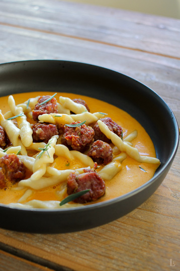 Selbstgemachte Trofie mit Paprikaschaumsauce und Salsiccia