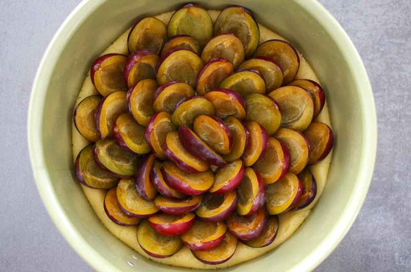 - Die vorbereiteten Zwetschgen dicht an dicht mit der Schnittfläche nach oben in Kreisen auf dem Teigboden verteilen. Tipp: Je enger sie liegen, desto saftiger wird der Kuchen.