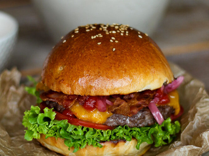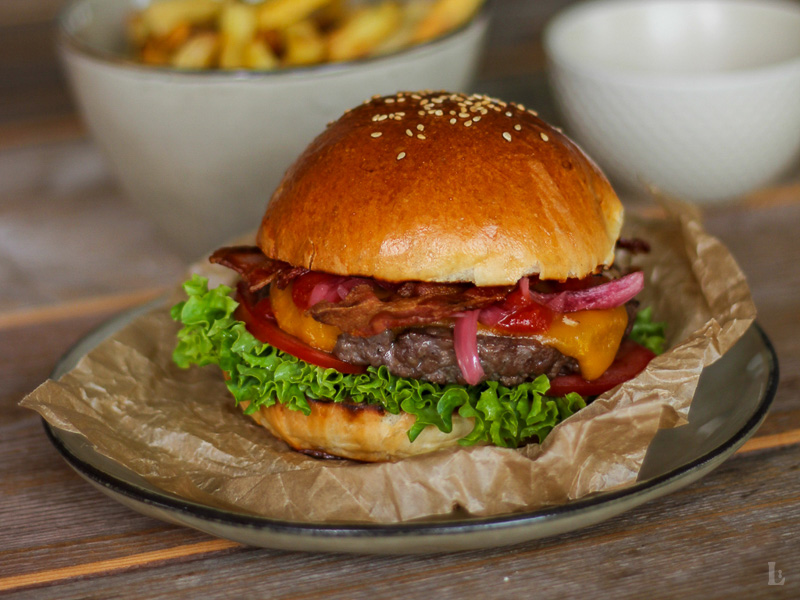 Beim Grillen setzt die Maillard-Reaktion ein: Außen knusprig, innen saftig, mit einem Schmelz aus Cheddar obendrauf. Dazu kommt knuspriger Bacon, frische Tomate, ein Klecks Senf, Ketchup und als Krönung: deine selbst gepickelten roten Zwiebeln. Die bringen Süße, Säure und den gewissen Kick, der alles zusammenbringt.