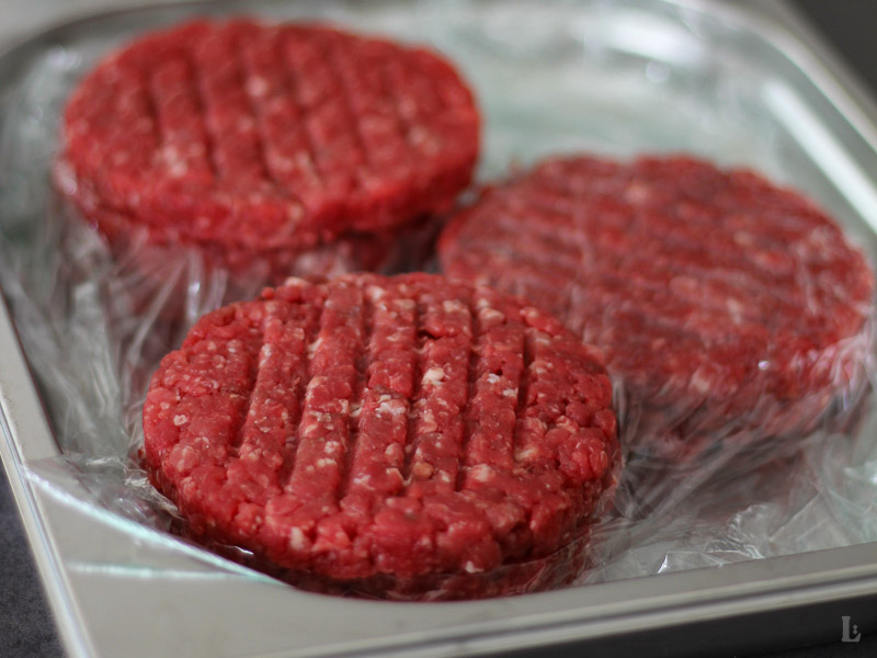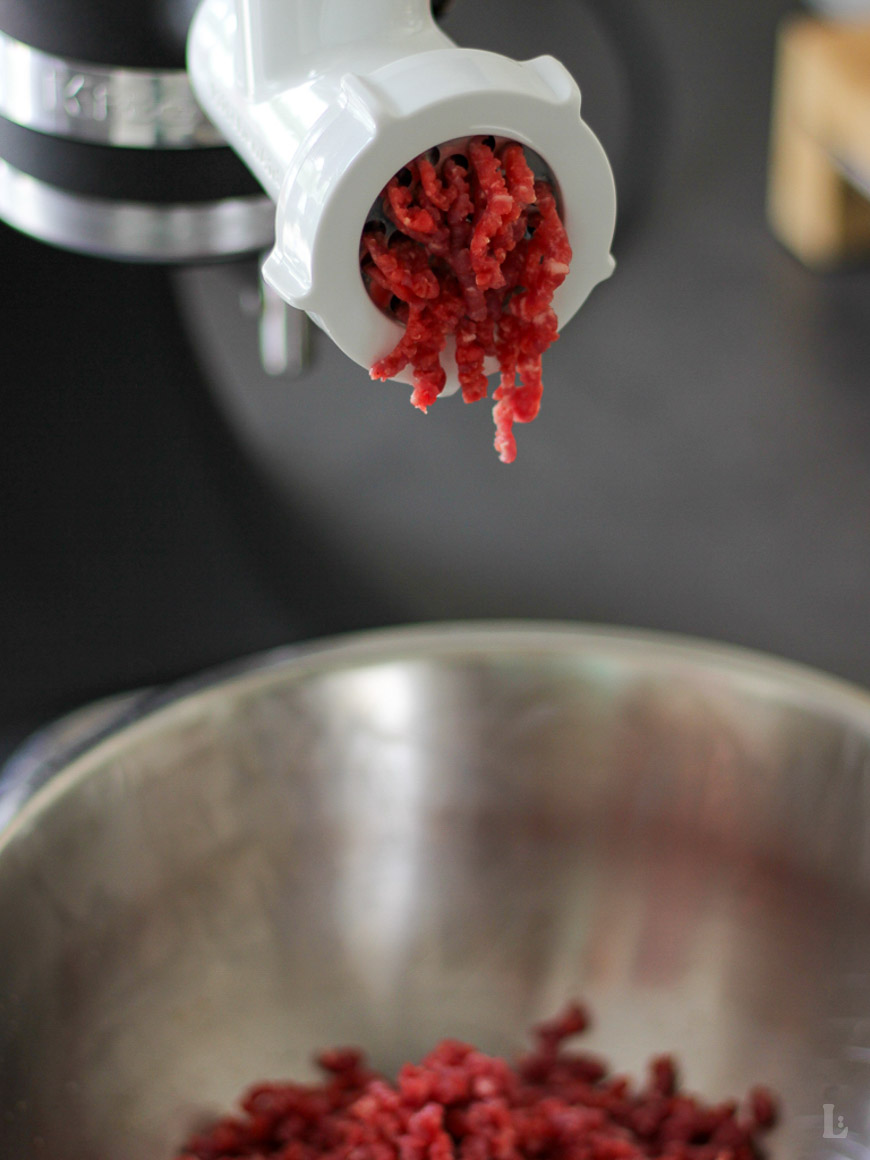 • (Alternativ: Fleisch beim Metzger wolfen lassen oder 450 g Rinderhack mit ca. 20% Fettanteil kaufen)