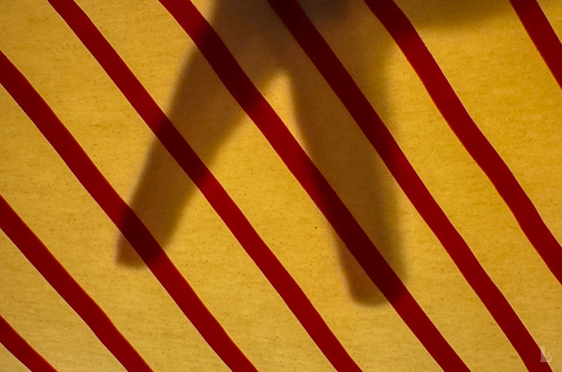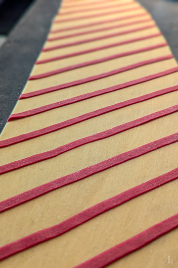 - Die Teige auf einer bemehlten Fläche oder mit einer Nudelmaschine dünn ausrollen (ca. 1 mm). Den hellen Teig bis zur weiteren Verwendung mit einer Folie abdecken, damit er nicht austrocknet. Den roten Teig in ca. 0,5 cm breite Streifen schneiden (kurze Seite). Die farbigen Teigstreifen schräg auf die helle Nudelbahn legen, vorsichtig andrücken und erneut durch die Maschine ausrollen, damit die Farben sich verbinden.