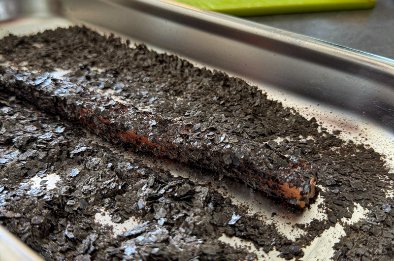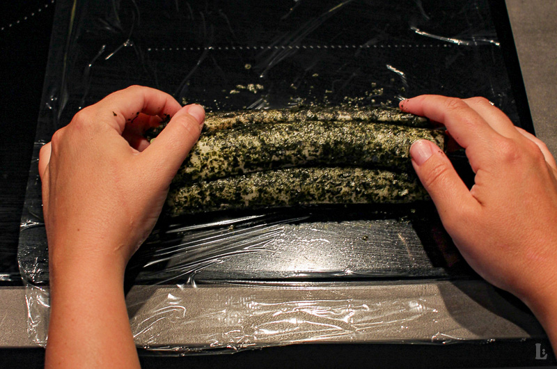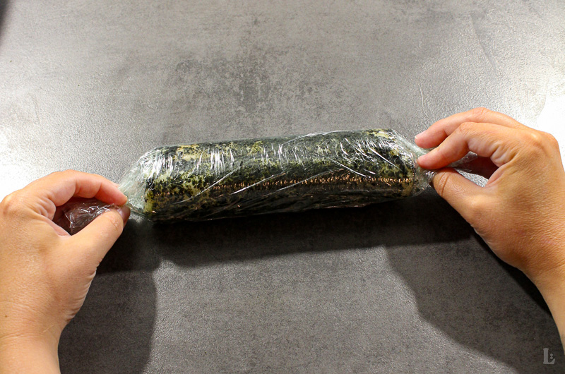 • Die Streifen auf Frischhaltefolie dicht nebeneinanderlegen und mithilfe der Folie zu einer straffen Rolle formen. Durch wiederholtes Rollen auf der Arbeitsfläche zieht sich die Folie fester zusammen. Die Enden fixieren und die Rolle im Kühlschrank mindestens einige Stunden, besser über Nacht, ruhen lassen.