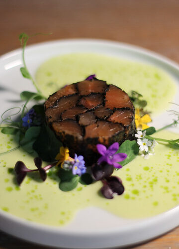 • Microgreens und essbare Blüten kranzförmig um die Rolle setzen. Den Gurken-Buttermilch-Sud mit etwas Bärlauchöl verrühren, sodass grüne Punkte entstehen. Den Sud direkt am Tisch angießen.