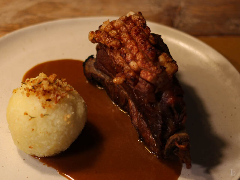 Dazu gibt’s einen kräftigen Bratensud und die unverzichtbaren halb-halb Kartoffelklöße, die mit ihrer flaumigen Konsistenz perfekt zur sämigen Sauce passen. In meiner Familie dürfen in den Klößen außerdem die Gläißbräggerla auf keinen Fall fehlen! Das sind Croutons, die in Butter golden gebraten werden und – so mache ich es – danach in frisch gehackter Petersilie gewälzt und abschließend als Kern im Kloß versteckt werden.