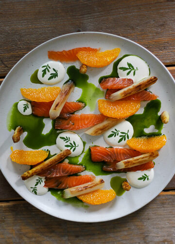 Ein frisches, leichtes Sommergericht, das Eleganz und Aromenvielfalt vereint: gebeizter Lachs trifft auf zarten weißen Spargel, fruchtige Orangenfilets, aromatisches Bärlauchöl und cremige Crème fraîche. Dieses Rezept verbindet saisonale Zutaten mit einer modernen Zubereitung. Der Lachs wird über Nacht gebeizt und erhält so eine zarte Textur und feines Aroma. Der weiße Spargel bleibt durch schonendes Garen knackig, während Orangen Frische und Säure ins Spiel bringen. Bärlauchöl sorgt für einen kräuterigen Kick, und Crème fraîche macht den Teller rund.